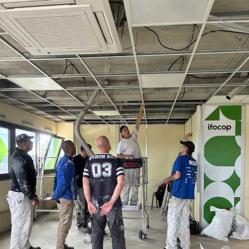 Au programme : en 2024, rénovation des plafonds et pose de dalles LED ; puis en 2025, amélioration des salles de formation avec un rafraîchissement des murs et une nouvelle mise en peinture. Ces interventions ont été réalisées par des équipes en insertion, encadrées par Karim, chef de chantier dans le secteur du second œuvre chez Initiatives77.