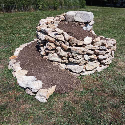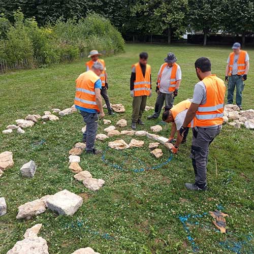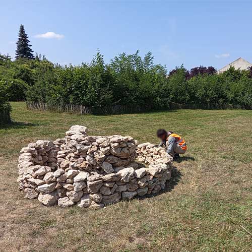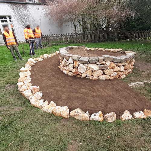 Sous la supervision de François, une équipe de 10 salariés en parcours d’insertion a mené à bien, en deux semaines, la réalisation de quatre spirales aromatiques en pierre, du tracé jusqu’à la construction complète. L’équipe a ensuite procédé à l’apport de terreau, destiné à accueillir les futures plantations.